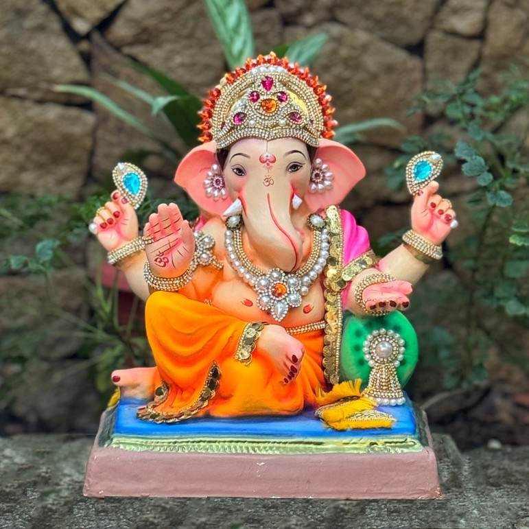 Our paper mache Ganesh idols are perfect for home immersion as they dissolve completely within 72 hours, causing no harm to marine life. With a 2-feet paper mache idol weighing only about 8 kg (compared to over 30 kg for clay idols), they are easy to courier across India and abroad, making them ideal for families celebrating Ganesh Chaturthi globally.