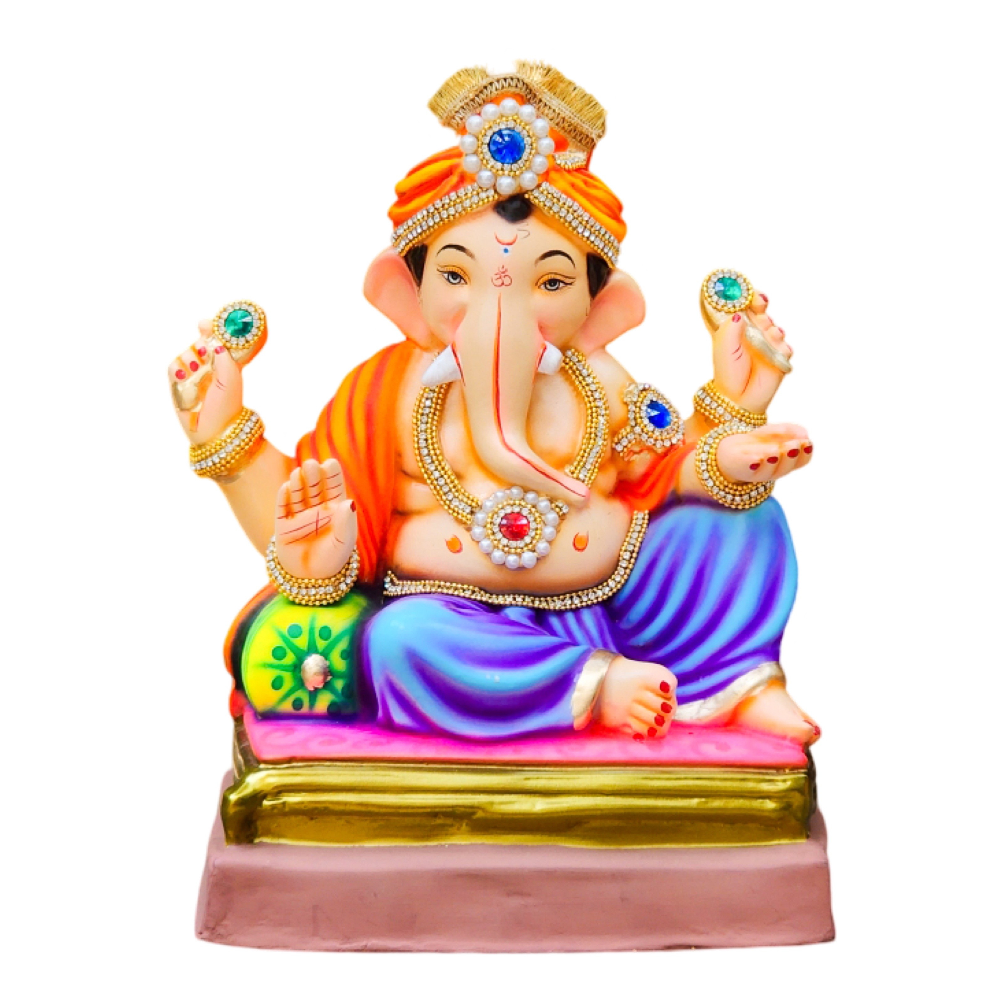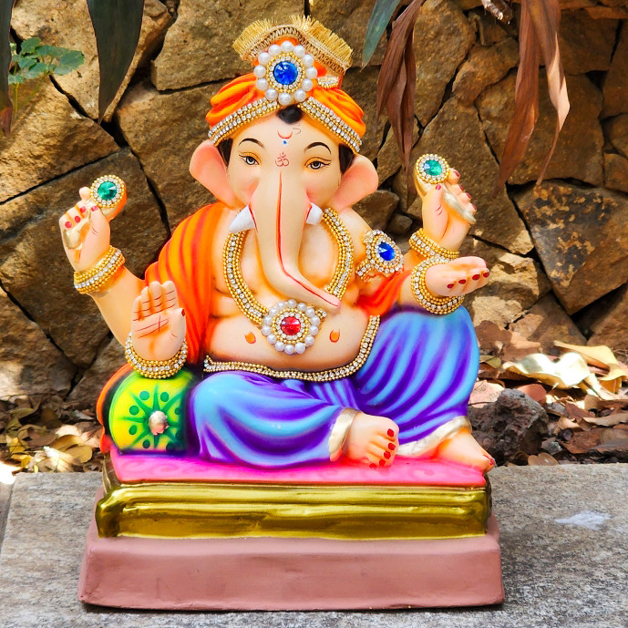 Our paper mache Ganesh idols are perfect for home immersion as they dissolve completely within 72 hours, causing no harm to marine life. With a 2-feet paper mache idol weighing only about 8 kg (compared to over 30 kg for clay idols), they are easy to courier across India and abroad, making them ideal for families celebrating Ganesh Chaturthi globally.